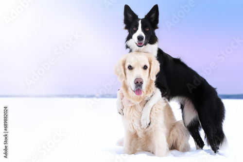 Obraz premium Black and white border collie hugs his golden retriever friend in a winter field
