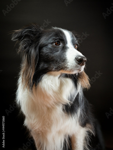 © Mariana, Fototapeta premium Black and white border collie portrait on black background