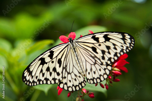 © Bob, Fototapeta premium Black and white butterfly on a green leaf