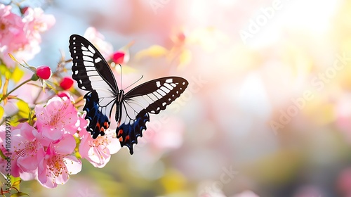 © Qolbi, Naklejka premium Black and white butterfly on pink blossoms in sunlight.