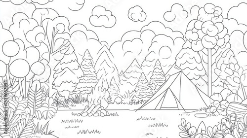 © Rena, Fototapeta premium Black and white camping scene in a forest.