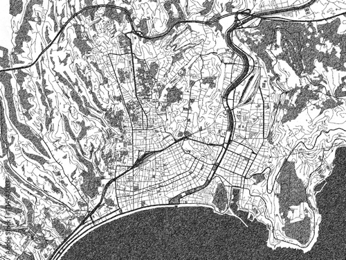 © W&S Stock, Naklejka premium Black and white cartographic illustration of Nice, France, in hand-drawn sketch form.