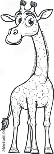Naklejka premium Black and white cartoon illustration of a cute giraffe with big eyes and long neck in a playful style.