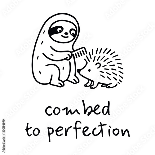 © Lena, Naklejka premium Black-and-white cartoon illustration of sloth combing hedgehog’s spines with “combed to perfection” message in whimsical pet grooming theme