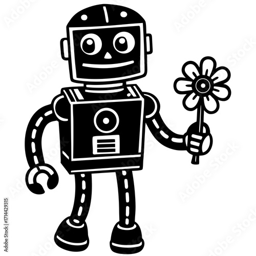 Fototapeta premium Black and white cartoon robot holding tiny flower, bold comic-style outline,...