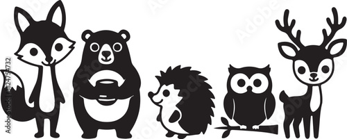 © PixelSaga MH2 , Fototapeta premium Black and white cartoon silhouettes of a fox, bear, hedgehog, owl, and deer standing in a row Keywords: cartoon, silhouette, animals, fox, bear, hedgehog, owl, deer, forest on transparent background