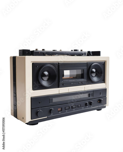 © haloviss, Obraz premium Black and white cassette tape player on isolated PNG background.