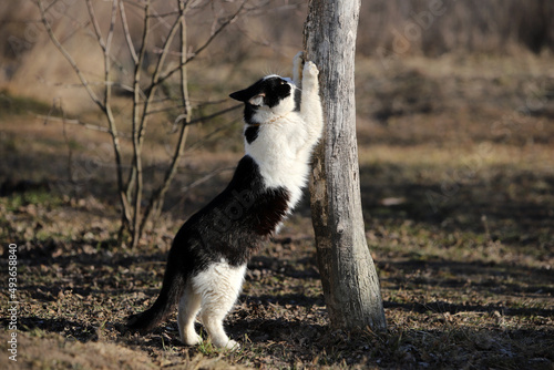 © Viktoriya, Fototapeta premium black and white cat on the ground