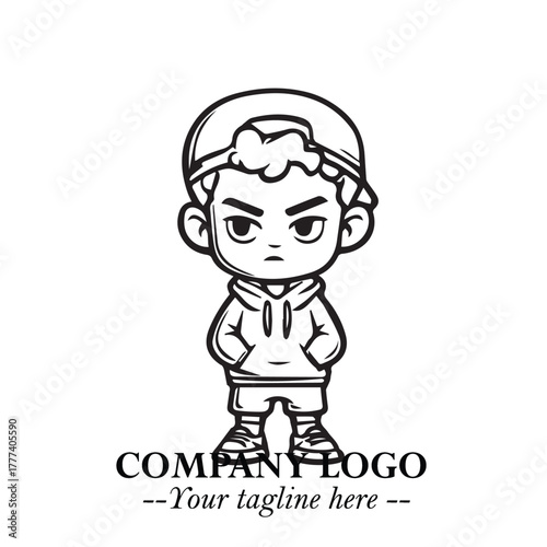 © Wacy, Obraz premium Black and White Chibi Boy Illustration with Jacket and Boots in Bold Thick Line Art Minimal Style