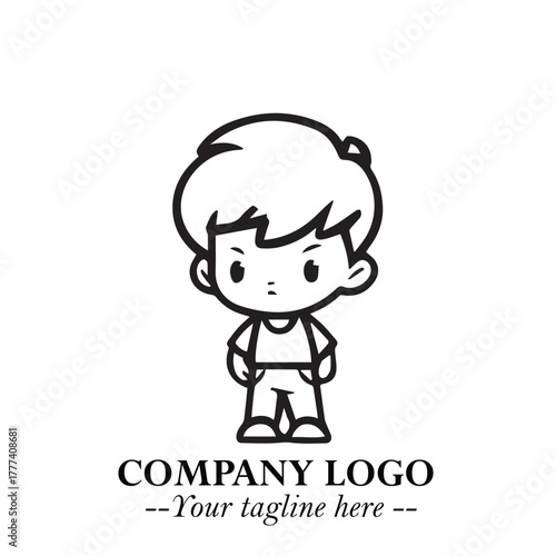 © Wacy, Obraz premium Black and White Chibi Boy Illustration with Jacket and Boots in Bold Thick Line Art Minimal Style