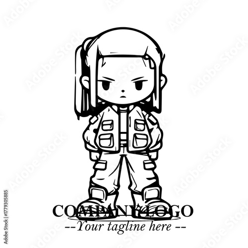 © Lilik, Fototapeta premium Black and White Chibi Girl Standing in Jacket, Pants, and Boots. Simple Bold Vector Illustration