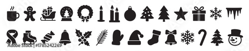 © Jafree, Obraz premium Black and white christmas and new year icons set featuring holiday symbols including gifts, snowflakes, candles on white background. seasonal decor, winter festivity, celebration, design elements