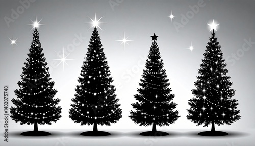 © sala, Fototapeta premium Black and White Christmas Tree Silhouette Vector Set with Festive Lights