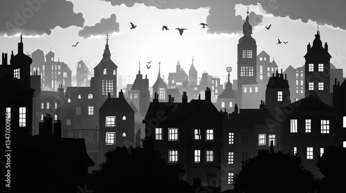 © jambulart, Fototapeta premium Black and white city silhouette with flying birds