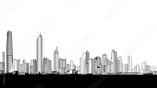 © Kitta Studio, Fototapeta premium Black and White City Skyline Silhouette Line Art Style Illustration