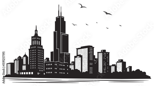 © Misbah, Naklejka premium Black and white cityscape skyline illustration with skyscrapers and birds flying in the sky vector image