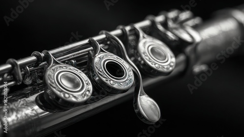 © titik, Fototapeta premium Black and white close-up of a flute with intricate keys, lying on a dark background