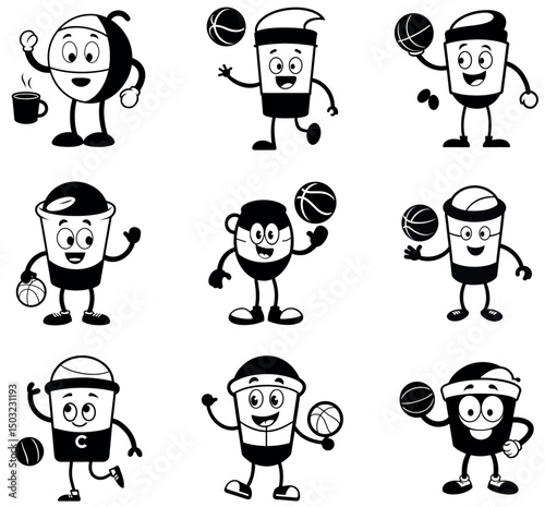 Fototapeta premium Black and White Coffee Cup Characters Playing Basketball – Fun Beverage Mascot Set