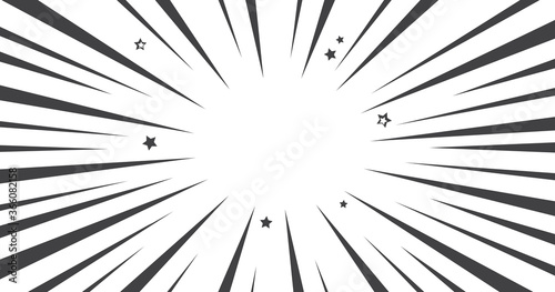Obraz premium Black and white comic pop art abstract halftone background with sunbeams, stars, space for your text. Vector illustration