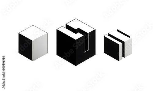 © john, Obraz premium Black and white Cube logo, geometric vector design. Set box logotype company, trendy techno emblem in isometric 3D style.