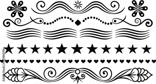 Fototapeta premium Black and white decorative elements borders lines stars hearts and floral flourishes for design use