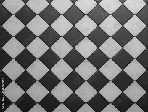 Fototapeta premium black and white diamond tile checkerboard with textured, worn surface and...