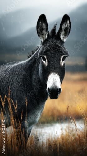 © Georg, Fototapeta premium Black and white donkey standing in a field during a cloudy day with tall grass in the background