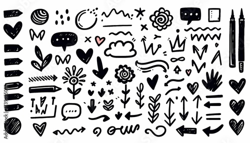 Obraz premium Black and white doodle set. Hand-drawn minimalist icons, arrows, hearts, and decorative elements.