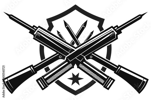 Naklejka premium Black and white emblem with crossed rifles and spears behind a shield with a star