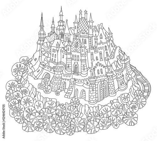 Fototapeta premium Black and white fantasy landscape, medieval castle town. Adults and children Coloring Book page