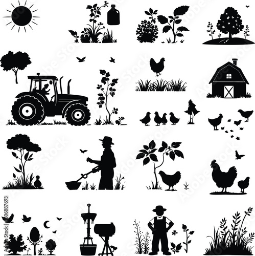© nasreenvidz, Fototapeta premium Black and white farm scene featuring a tractor, farmer, chickens, barn, and various plants and trees