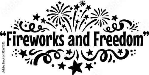 Fototapeta premium Black and white fireworks and freedom phrase with stars and swirls vector art