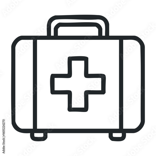 Obraz premium Black and white first aid kit icon with handle and cross symbol. Vector...