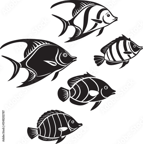 © Faysal, Fototapeta premium Black and White Fish Illustration Set Angelfish Moorish Idol