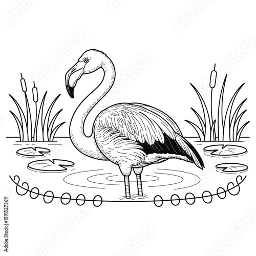 © kamrunnaher, Fototapeta premium Black and White Flamingo in Water with Lily Pads and Reeds