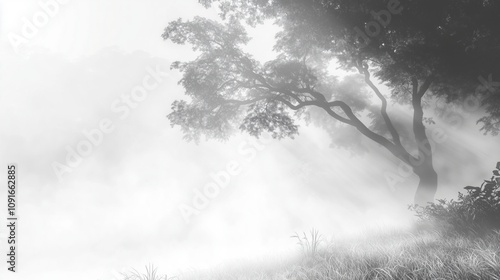 Obraz premium Black and white foggy landscape with tree and soft light beams