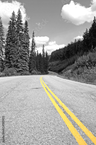 © Dave Timms, Naklejka premium Black and White Forest Highway in British Columbia with Yellow Road Markings Leading to the Horizon