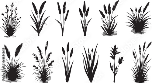 Naklejka premium Black and white grass vector set: ornamental grasses, plants, and botanical illustrations eps silhouette