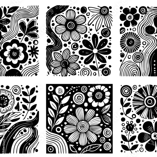 © Achmat, Obraz premium black and white groovy abstract flower posters. Floral doodle naive patterns. Contemporary matisse style. Trendy vector set.