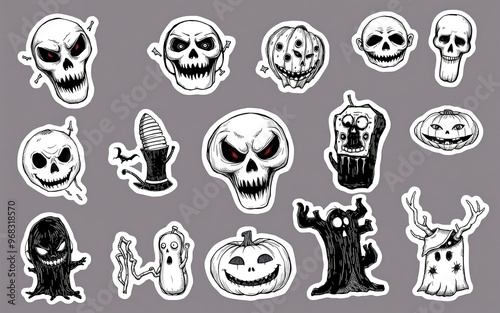 © AkeemAsmaa, Obraz premium Black and white Halloween stickers with spooky characters and pumpkins for festive decoration.