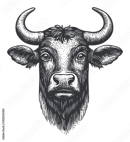 Naklejka premium Black and White Hand Drawn Bull Head in Vintage Linocut Style