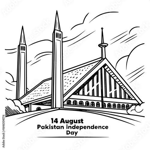 © Rana, Fototapeta premium "Black and white, hand-drawn style sketch of Faisal Mosque’s iconic triangular roof and minarets, perfectly centered in composition. Elevated viewpoint. Beneath the mosque: bold uppercase text '14 AUG