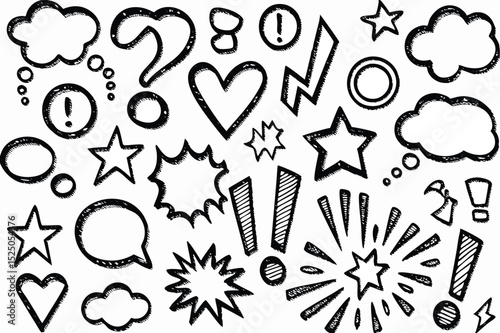 Obraz premium Black and White HandDrawn Doodle Sketch Assortment with Clouds, Stars, and Exclamations Illustrations