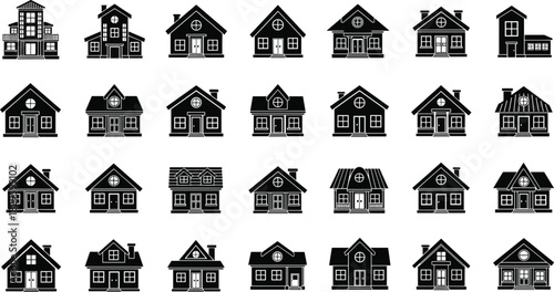 Naklejka premium Black-and-white house icon set, diverse residential architecture styles, roof and window variations, urban planning vector illustration
