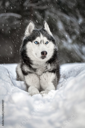Naklejka premium Black and white husky dog with blue eyes in snowy winter forest. Snowstorm...