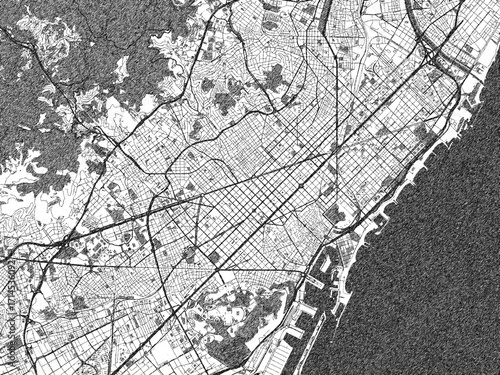 Naklejka premium Black and white illustrated map of Barcelona, Spain, with streets, rivers,...