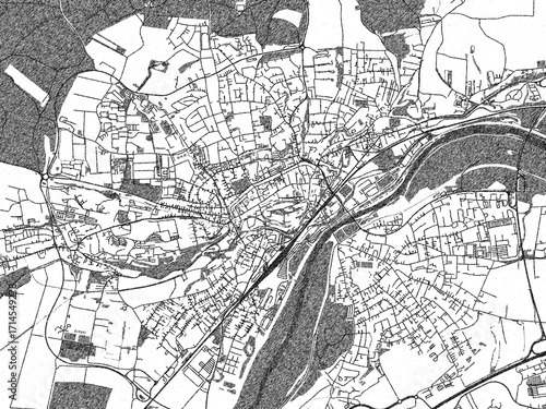 Naklejka premium Black and white illustrated map of Freising, Germany, with streets, rivers,...