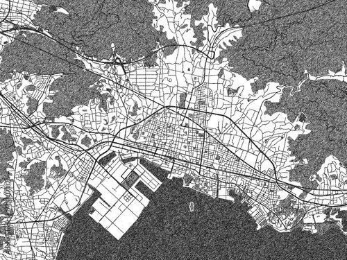 Naklejka premium Black and white illustrated map of Gamagori, Japan, with streets, rivers, and...