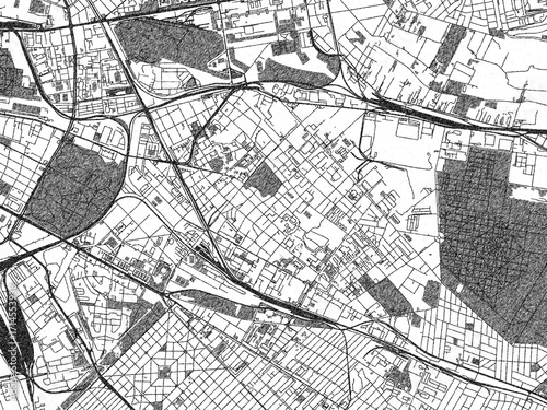 Naklejka premium Black and white illustrated map of Kobanya, Hungary, with streets, rivers,...