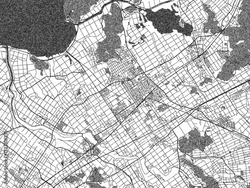 Naklejka premium Black and white illustrated map of Omihachiman, Japan, with streets, rivers,...
